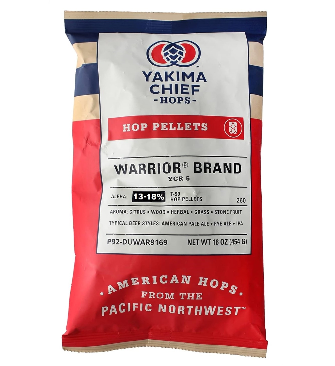 Developed by Yakima Chief Ranches, Select Botanicals Group, proprietary American hop Warrior® is fast becoming a favorite, especially with US craft breweries. Warrior or YCR 5 was selected for its high alpha content, low co-humulone, good storage stability and tolerance to powdery mildew (Growers like those last two!) Among its desirable traits are its clean, smooth bittering and a somewhat inconspicuous citrusy and spicy aroma. It is primarily used for its mild, clean bittering properties. Warrior is proprietary and the ancestry is not publicly known.