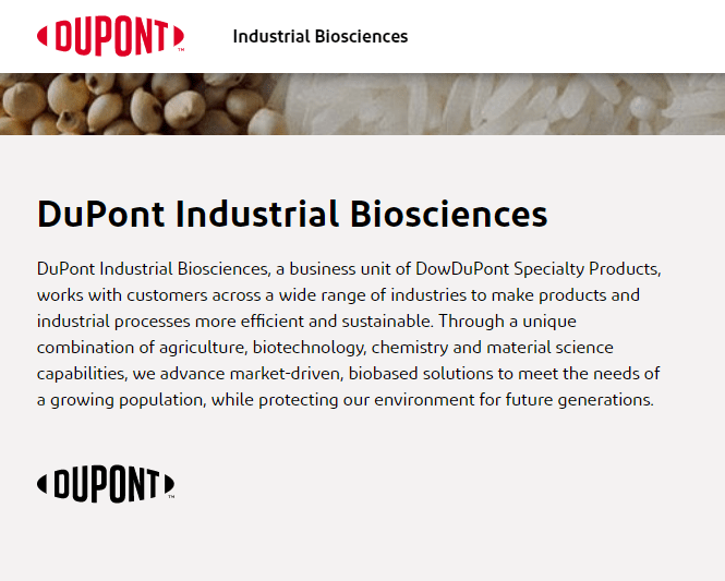 DuPont Industrial Biosciences is a business unit of Dow DuPont and works with customers across a wide range of industries to make products and industrial processes more efficient and sustainable. Through a unique combination of agriculture, biotechnology, chemistry and material science capabilities, we advance market-driven, biobased solutions to meet the needs of a growing population, while protecting our environment for future generations.