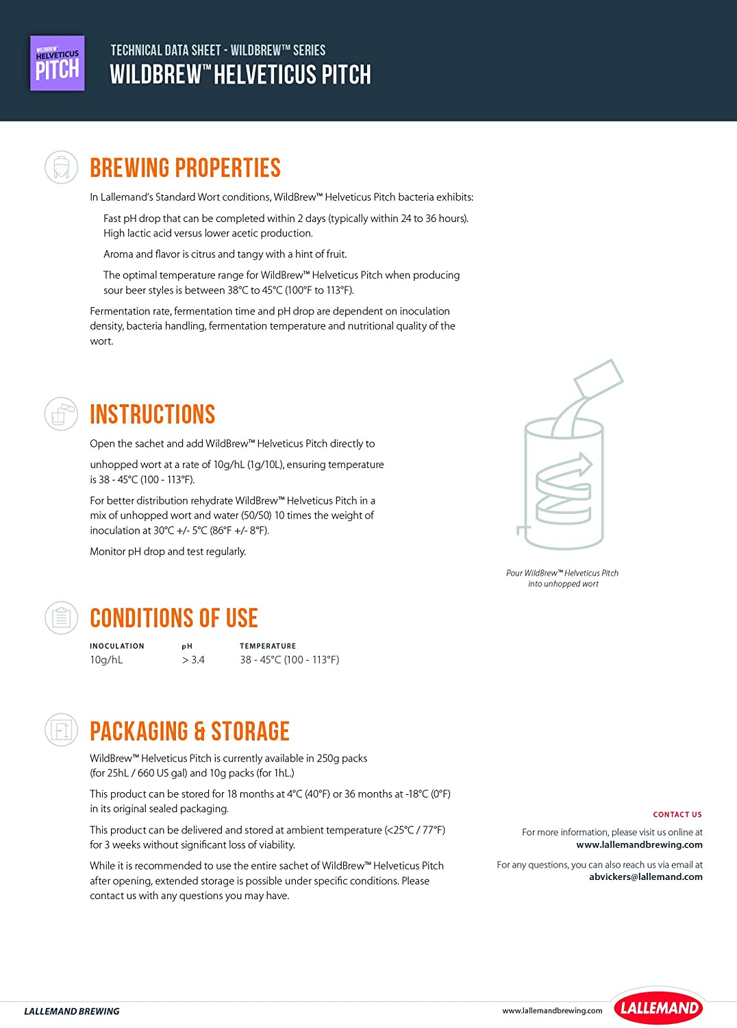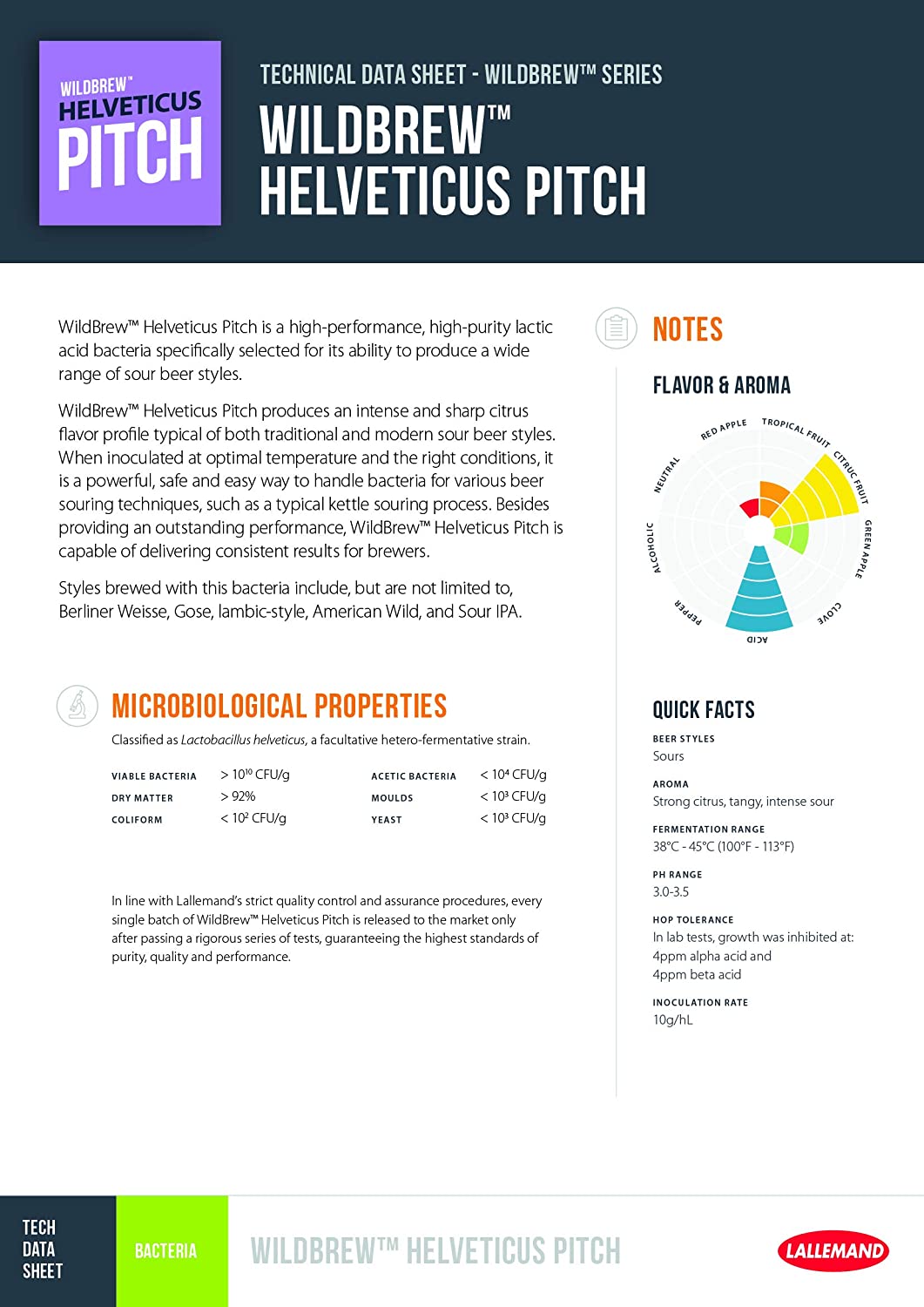 WildBrew™ Helveticus Pitch is a ready-to-use dried bacteria, a strain of Lactobacillus helveticus specifically selected for its ability to produce a wide range of sour beer styles. In comparison to WildBrew™ Sour Pitch, the new bacteria produces a more intense citrusy flavor at higher temperatures. Additionally, WildBrew™ Helveticus Pitch will deliver unmatched consistency, effortless application, fully assured performance and unparalleled purity for brewing the sour beer style of your choice.